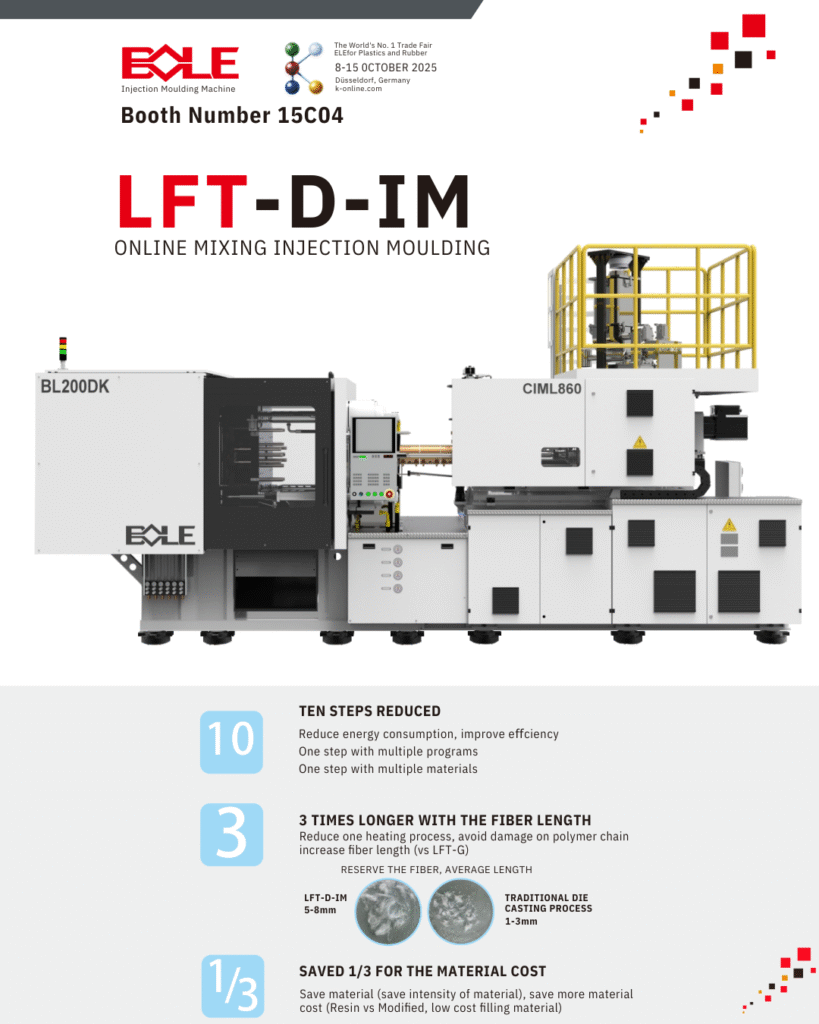 For applications that require exceptional strength and lightweight performance, Bole introduces the LFT-D-IM (Long Fiber Thermoplastic Direct Injection Moulding) technology. Unlike traditional die casting, which produces shorter fibers of 1–3 mm, the LFT-D-IM process achieves fiber lengths of 5–8 mm. This results in components with significantly enhanced mechanical properties and durability. The technology streamlines processing by reducing heating steps and minimizing polymer chain damage, ultimately increasing fiber retention. In addition, the system enables savings of up to one-third in material costs through optimized resin modification and the use of low-cost fillers. LFT-D-IM opens new possibilities for industries such as automotive, aerospace, and consumer electronics, where lightweight yet high-strength parts are crucial.