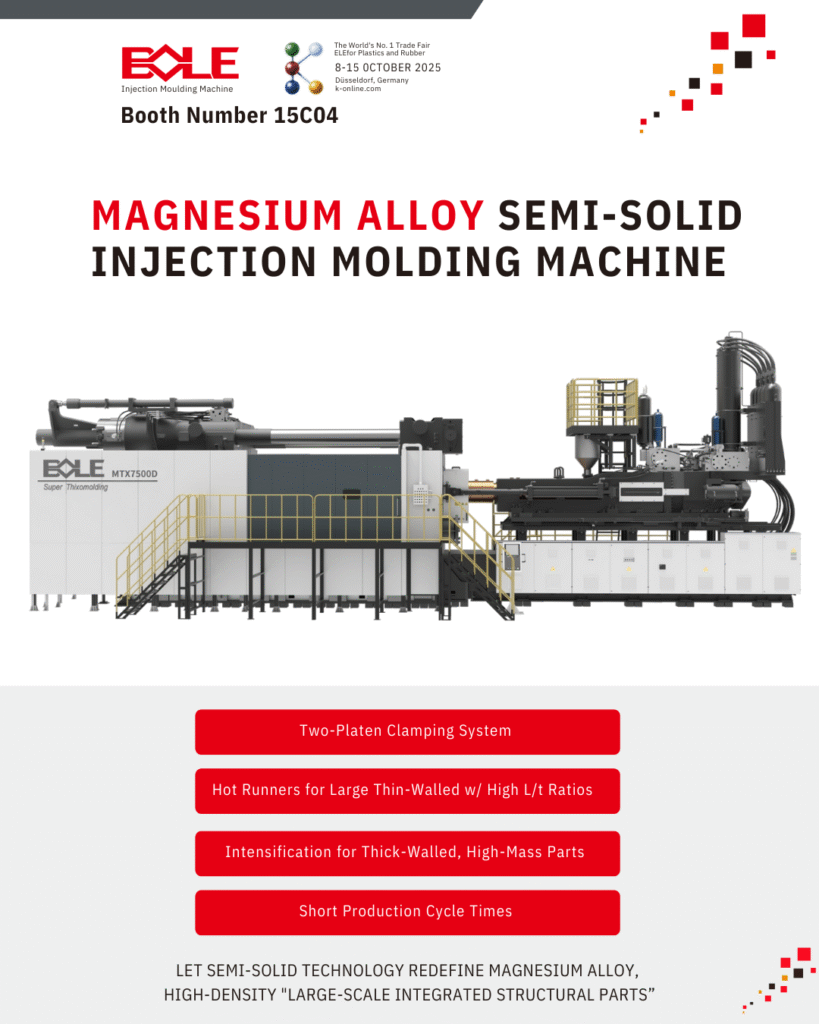 In response to the increasing need for lightweight materials in automotive, aerospace, and consumer products, Bole highlights its Magnesium Alloy Semi-Solid Injection Moulding technology. This advanced solution employs a two-platen clamping system combined with hot runner technology for large, thin-walled parts with high L/t ratios. It also allows intensification for thick-walled, high-mass components, all while maintaining short cycle times. By leveraging semi-solid processing, Bole enables the production of high-density, large-scale integrated structural parts that are lighter, stronger, and more sustainable. This technology is a game-changer for industries looking to reduce weight without compromising performance.